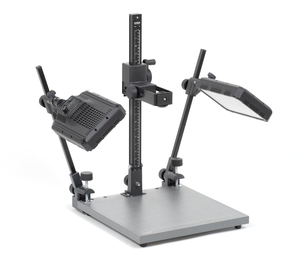 Bærbar affoto stand. Ikke-reflekterende mat grå bund plade med trykt tern (cm / tommer skala). Komplet med LED lys